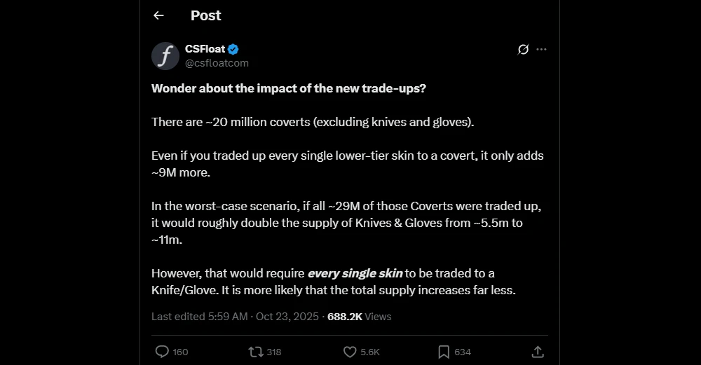 Valve-ov update 23. oktobra 2025. dozvolio je trgovinu pet covert skinova za noževe i rukavice, što je izazvalo haos na tržištu. Vrednost skinova pala za 30%, noževi gube do 70%. Saznajte šta se desilo i šta to znači za igrače!