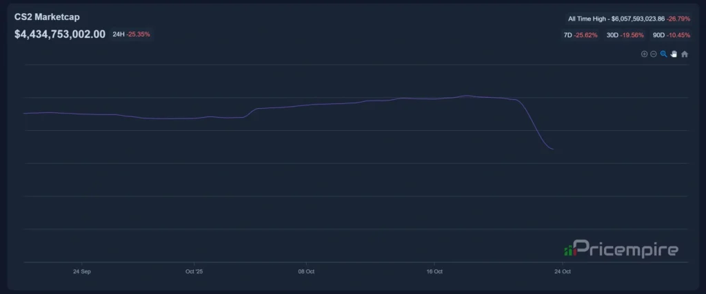 Counter-Strike 2 skin market je doživeo dramatičan pad – vrednost je pala za skoro 2 milijarde dolara preko noći. Valve-ov update 23. oktobra omogućio je trgovinu pet covert skinova za noževe i rukavice, što je izazvalo paniku među trgovcima.
