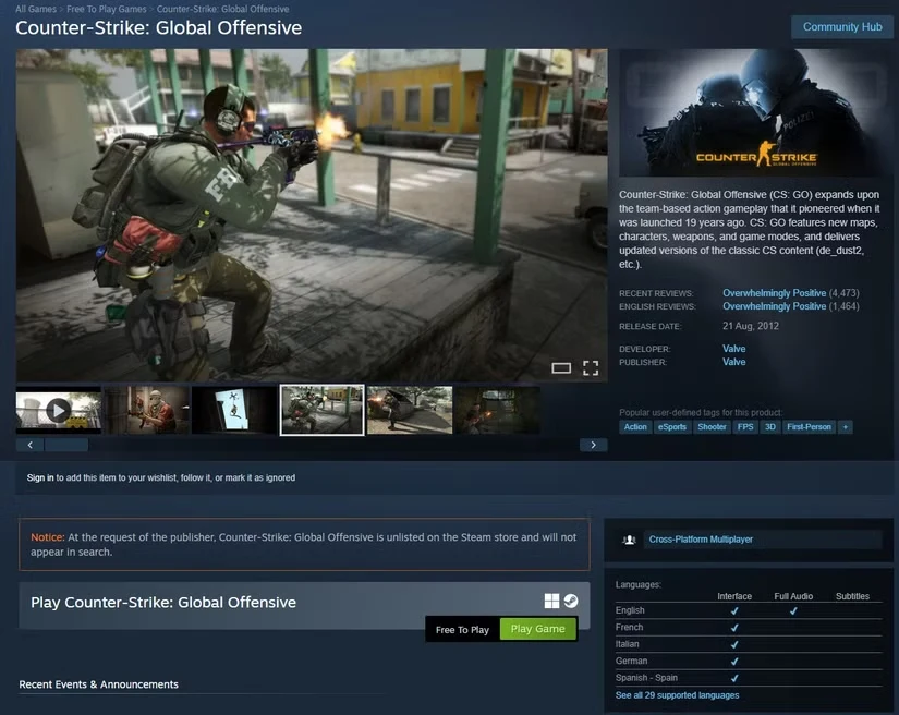 Nakon više od dve i po godine odsustva, CS:GO se ponovo pojavio na Steamu kao zasebna igra koju je moguće preuzeti. Podsećamo, Valve je svojevremeno odlučio da CS:GO potpuno zameni igrom Counter-Strike 2 kako bi izbegao cepanje igračke baze, što je naišlo na oštre kritike zajednice, pre svega zbog brisanja postignutih rezultata i dostignuća (achievements).