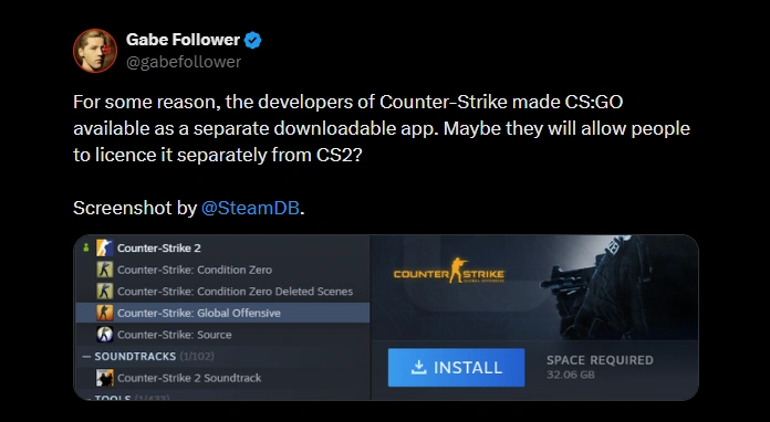 Postoje dva scenarija zašto se ovo dešava. Prvi, i manje uzbudljiv, jeste da Valve vrši restrukturiranje backend sistema, što je slučajno dovelo do toga da CS:GO postane vidljiv kao zaseban download. Drugi scenario, kojem se fanovi nadaju, jeste da Valve planira da igri dodeli zasebnu licencu, čime bi se omogućio rad zajedničkih (community) servera bez „tereta“ koji nosi CS2.