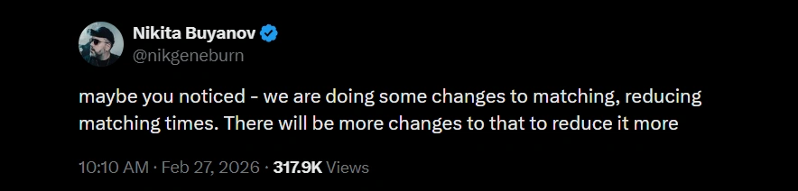 U objavi na mreži X, CEO studija Nikita Buyanov otkrio je da su uvedene promene koje direktno smanjuju vreme čekanja na meč. Na pitanje o detaljima, Buyanov je pojasnio sledeće ključne stavke: