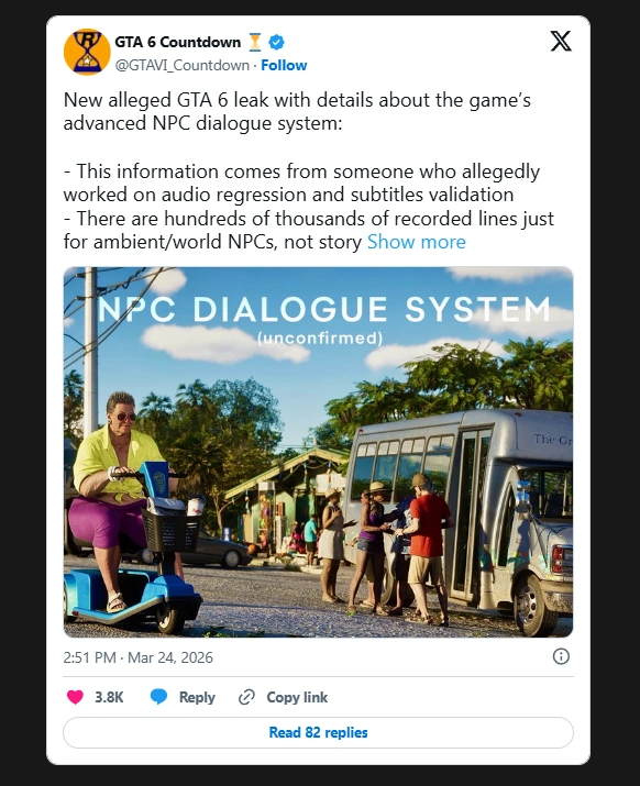 Prema izvorima bliskim timu za validaciju zvuka i titlova, GTA 6 će sadržati „stotine hiljada snimljenih rečenica“ namenjenih isključivo prolaznicima i sporednim likovima. Ovo je ogroman skok u odnosu na bilo koju prethodnu igru u serijalu, a cilj je da se izbegne ponavljanje istih fraza, čak i ako se igrač duže zadrži u istom kraju grada.