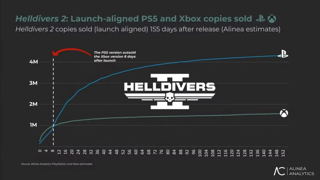 Podaci Alinea Analytics-a daju jasnu sliku o uspehu Xbox verzije. Helldivers 2 je prodao 1,6 miliona kopija za samo pet meseci na ovoj platformi. Najveći skok prodaje dogodio se odmah po izlasku na Xbox tržište. To potvrđuje da Xbox publika preferira pucačine sa vojnom naučnom fantastikom. Samo tokom decembra 2025. godine prodate su 3,6 miliona jedinica na svim sistemima.
