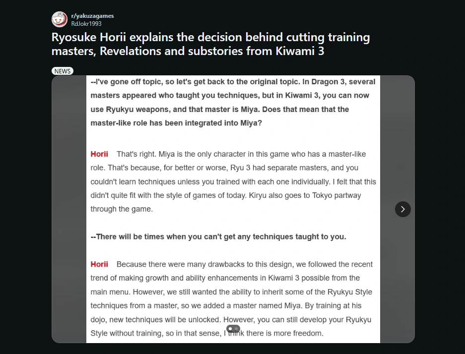 Dugoočekivani rimejk Yakuza Kiwami 3 & Dark Ties podigao je veliku prašinu u igračkoj zajednici, ali ne zbog grafičkih unapređenja, već zbog drastičnih rezova. U nedavnom intervjuu za Famitsu, reditelj serijala Ryosuke Horii pokušao je da opravda odluku studija da iz igre izbaci veliki broj kultnih sporednih priča (substories).