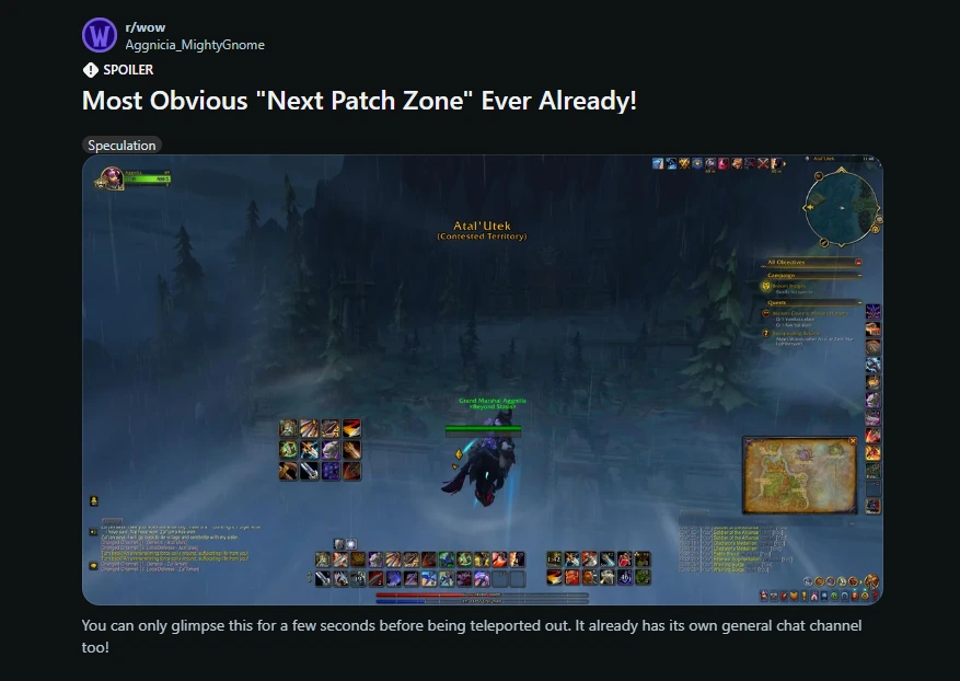- Chat kanali: Čim se približite granici, u igri se aktiviraju „General“ i „Local Defense“ kanali specifični za Atal’Utek, što potvrđuje da je zona već definisana u bazi podataka.