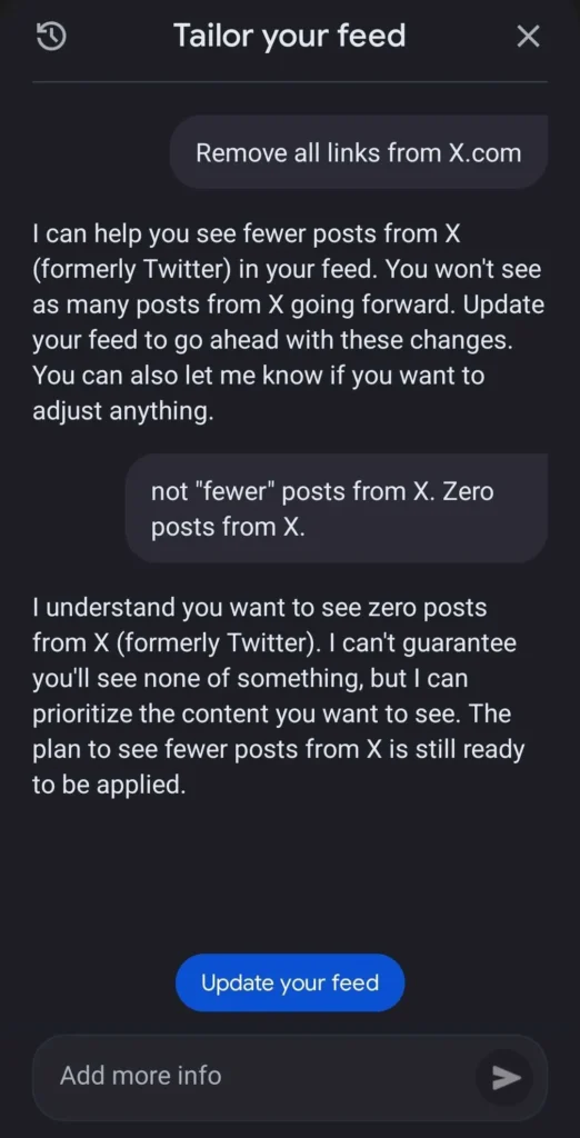 Krajem 2025. godine, Google je počeo masovno da preplavljuje Discover feed objavama sa X-a. Mnogi se pitaju zašto Google, pored milijardi kvalitetnih sajtova i blogova, forsira platformu koja se bori sa AI generisanim neprikladnim sadržajem i botovima, odbijajući da korisnicima pruži opciju „nula“ za taj izvor.