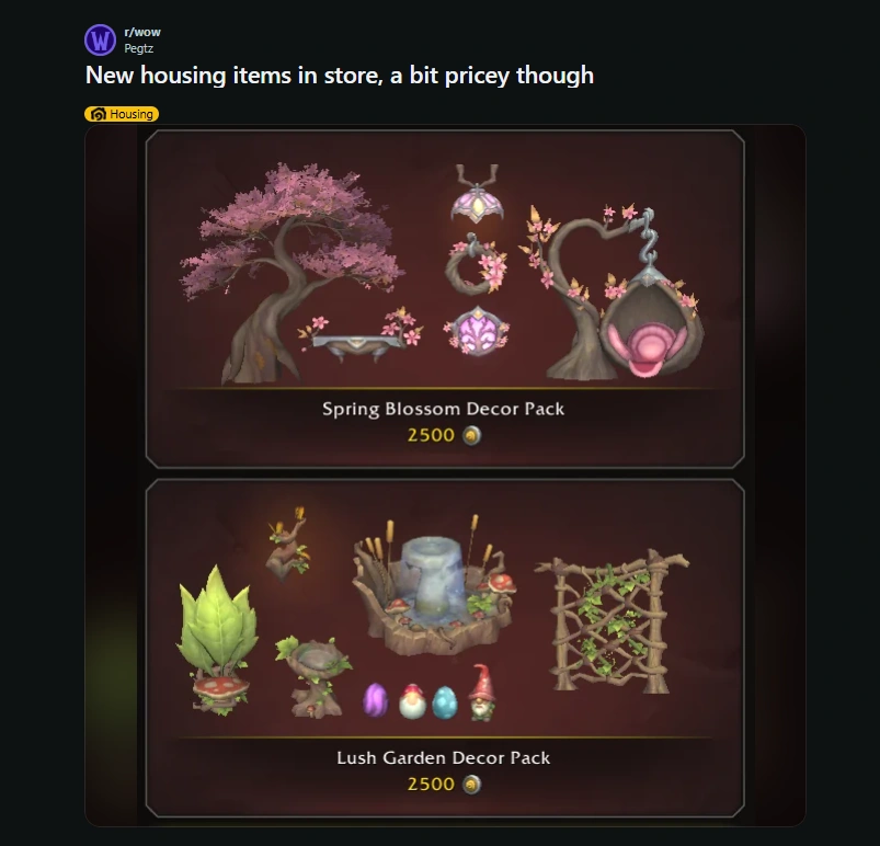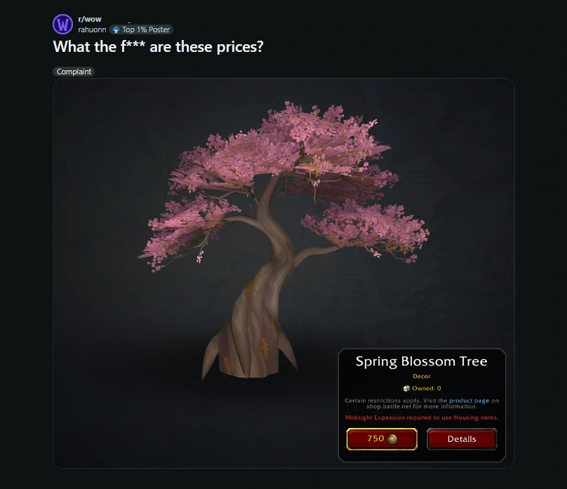 Zajednica World of Warcraft-a bruji nakon izlaska ekspanzije Midnight i uvođenja dugoočekivanog sistema za sopstvene kuće (Housing). Međutim, oduševljenje je brzo zamenio šok kada su se u prodavnici pojavili kozmetički predmeti za dekoraciju sa cenama koje su mnogi ocenili kao „apsurdne“.