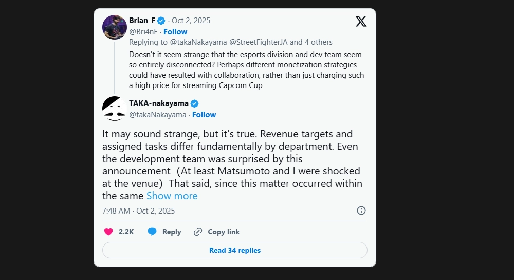Zajednica je optužila Capcom za pohlepu, posebno jer je Street Fighter 6 imao uspešnu 2025. godinu sa nagradnim fondom od 2 miliona dolara, ali bez sličnih prihoda od DLC-a kao u Street Fighter 5. Nakajama je 2. oktobra 2025. na X-u izjavio da je „čak i tim developera bio iznenađen“ (bar on i Šuhej Macumoto na događaju), naglašavajući razliku između razvojnog tima i esports odeljenja. „Izvinjavamo se zbog zabrinutosti koju smo izazvali“, rekao je, uz šaljivu napomenu: „Ako me kazne na poslu, obrisaću ovaj komentar.“