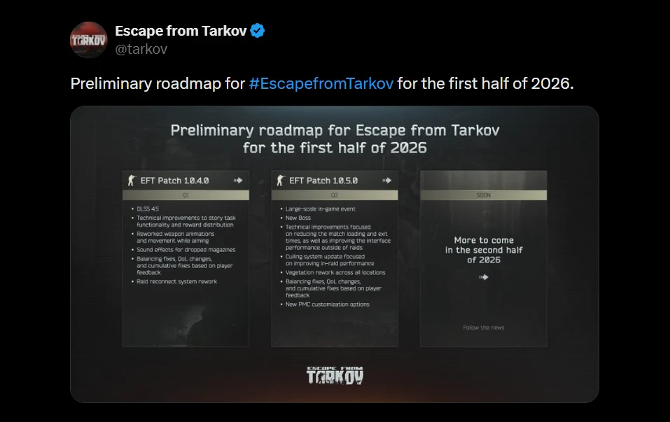 Battlestate Games je objavio planove za prvu polovinu 2026. godine. Nakon što je verzija 1.0 prošle godine naišla na podeljene reakcije zbog tehničkih problema, studio se fokusira na optimizaciju, ali i na sadržaj koji će produbiti lore igre kroz nove izazove u Norvinsk regiji.