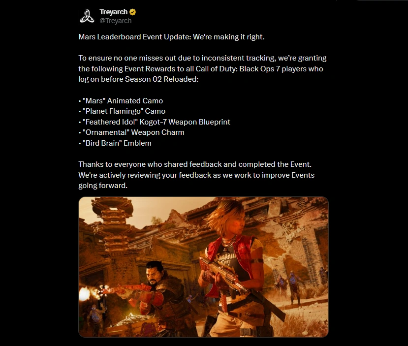 Nakon katastrofalnog starta Mars Leaderboard događaja u okviru Druge sezone, Treyarch je odlučio da „ispravi stvar“. Zbog brojnih tehničkih problema koji su onemogućili fer takmičenje, razvojni tim je objavio da će svih pet nagrada biti podeljeno apsolutno svim igračima koji se uloguju u igru u narednom periodu.