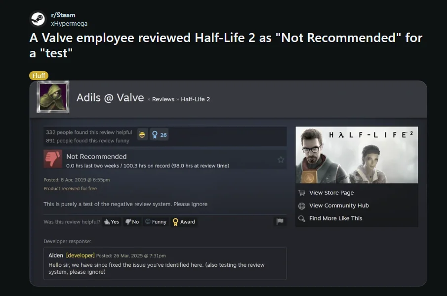 Negativnu recenziju je ostavio Adil Sardar, viši softverski inženjer u Valve-u. Iako na svom nalogu ima preko 100 sati igranja u ovom legendarnom naslovu, Sardar je igri dao crveni palac nadole.